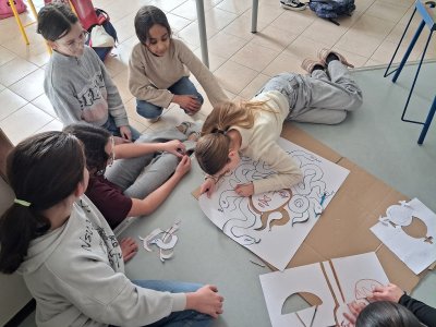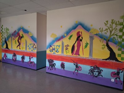 Cette année, il s’agissait de créer une fresque qui représente à nouveau l’idée de l’égalité filles/garçons à travers les mythes antiques et les figures des héros ou héroïnes, thèmes qui sont abordés en Histoire, en EMC et en Français en classe de 6ème et se poursuivent en lettres en classe de 5ème. Pour mener à bien ce projet, le collège Diderot a accueilli le graffeur Arcarooooo en résidence pendant quatre jours.